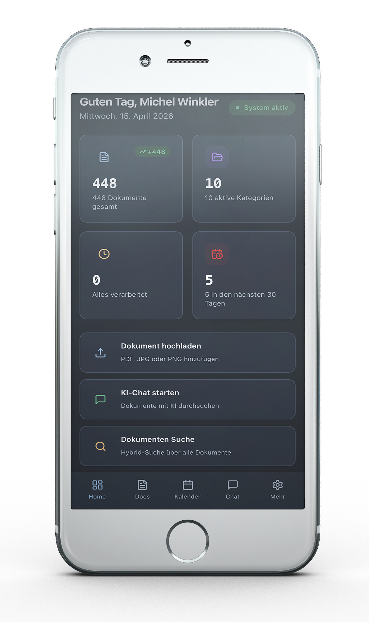 PDF, Fotos, Scans. Drag & Drop oder direkt vom Handy — DocFlow kümmert sich um den Rest.